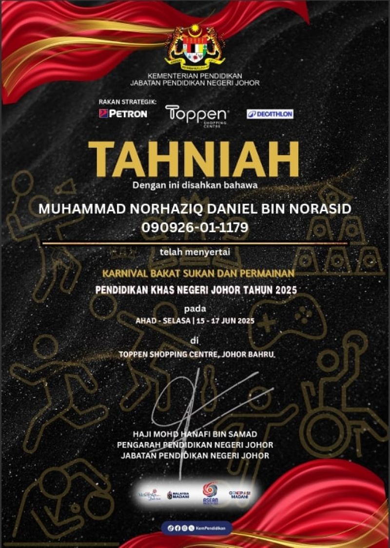 2 | MUHAMMAD NORHAZIQ DANIEL BIN NORASID | Penyertaan |