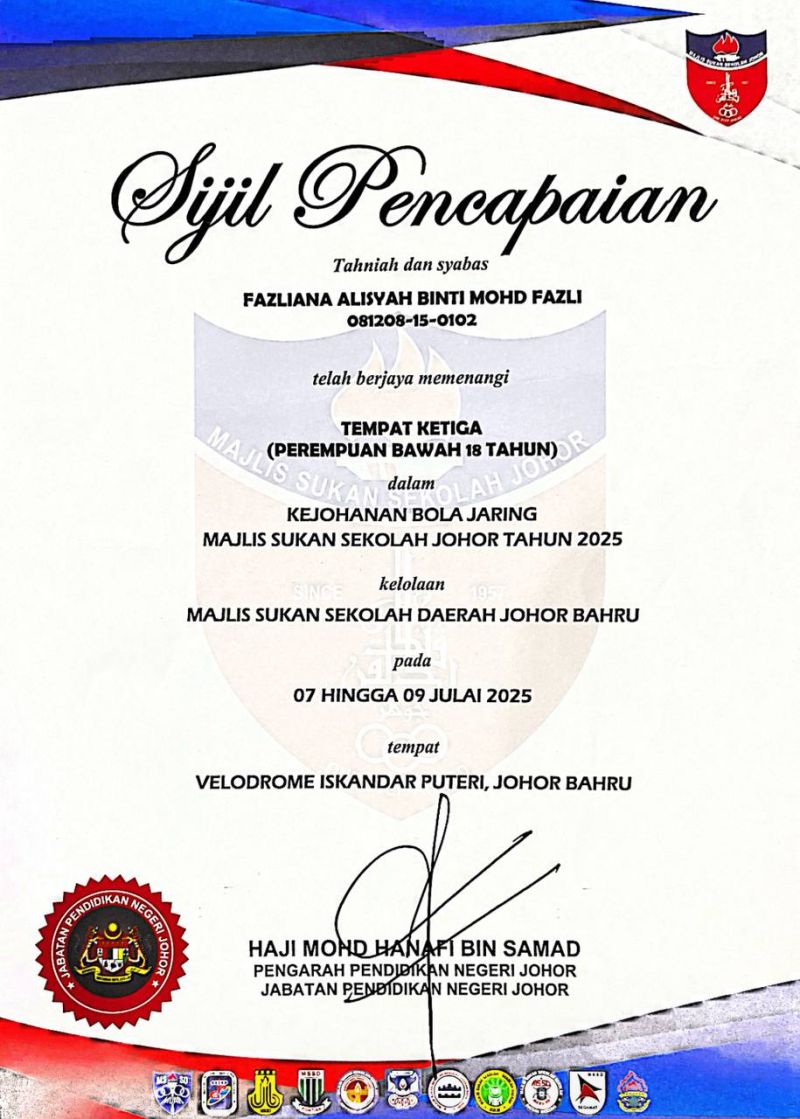 1 | FAZLIANA ALISYAH BT MOHD FAZLI | Ketiga |