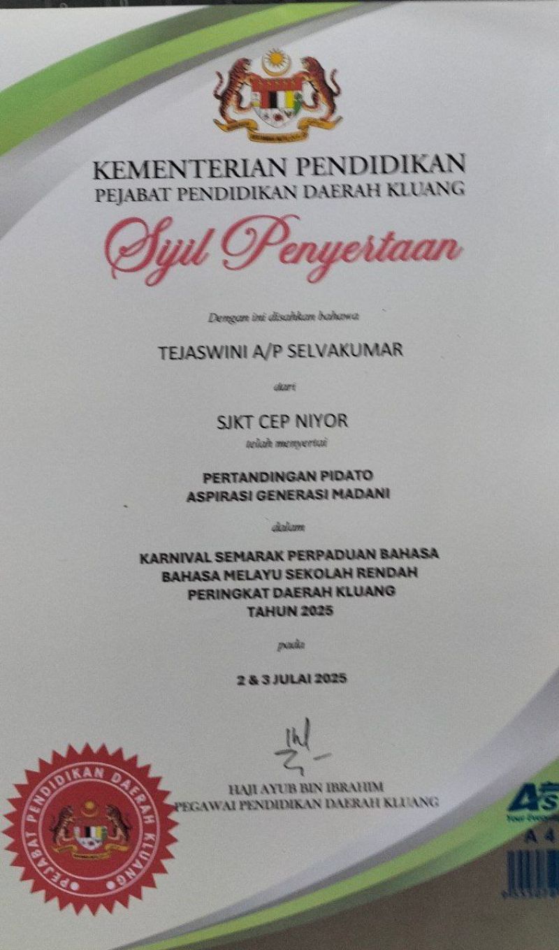 1 | TEJASWINI A/P SELVAKUMAR | Penyertaan |
