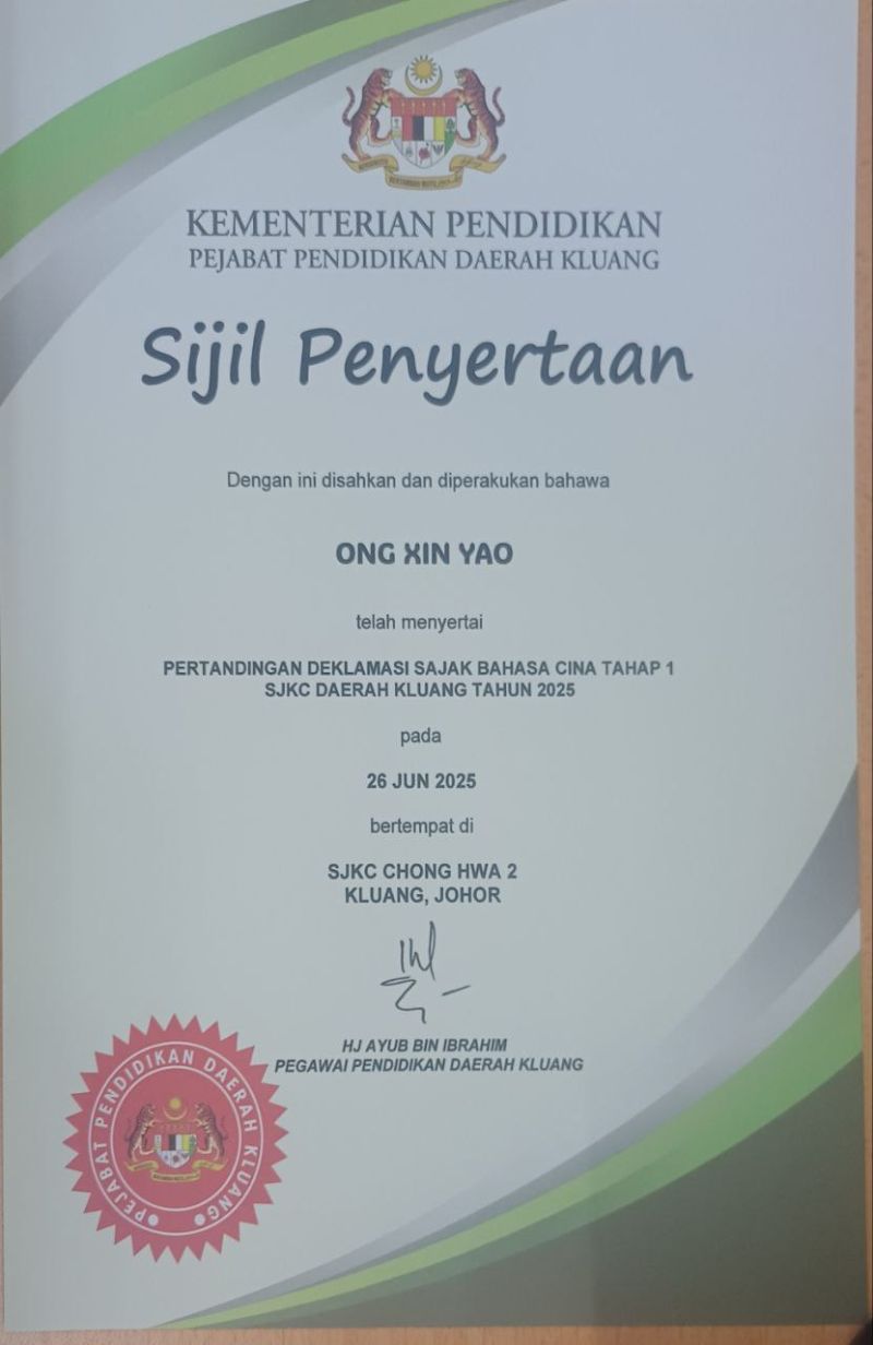 PERTANDINGAN DEKLAMASI SAJAK BAHASA CINA TAHAP 1 SJKC DAERAH KLUANG TAHUN 2025