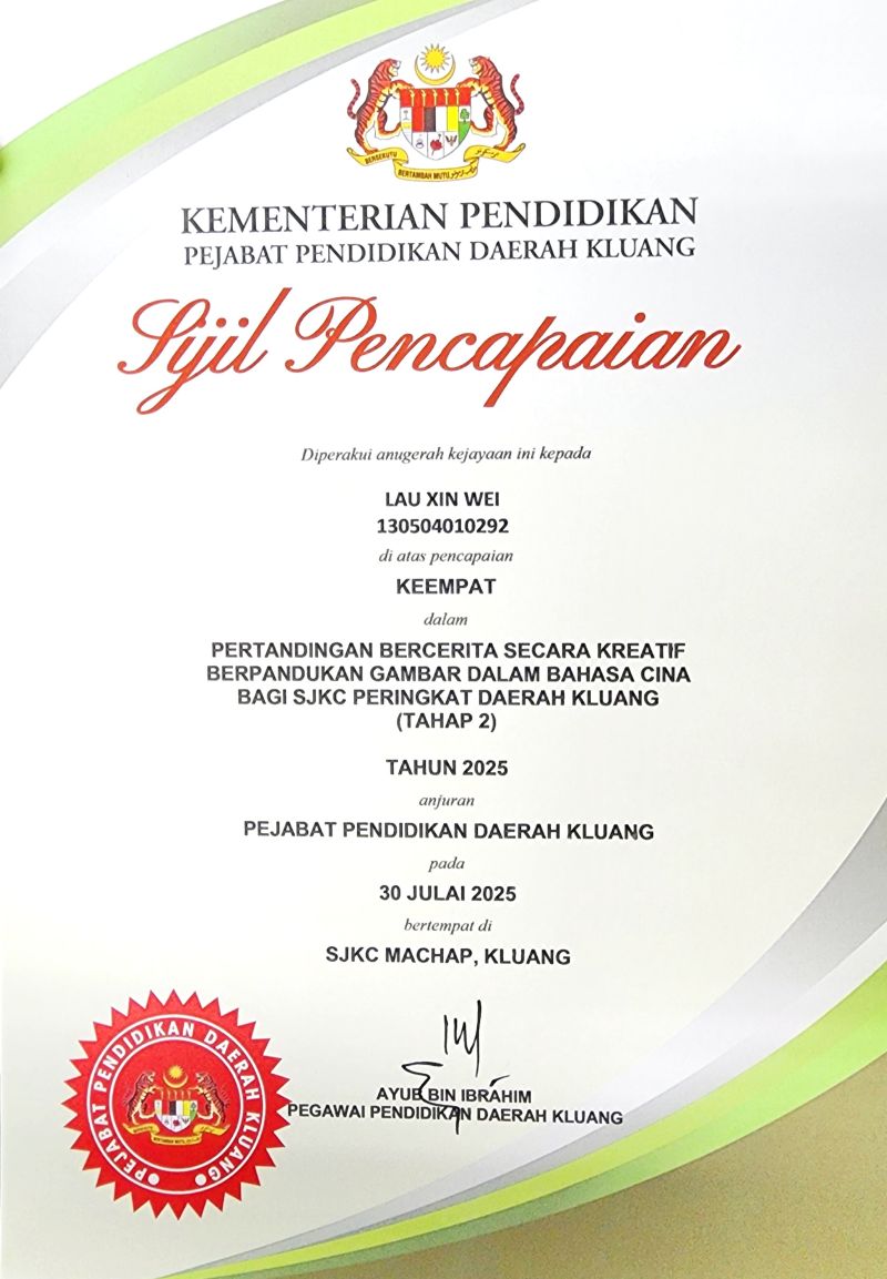 PERTANDINGAN BERCERITA SECARA KREATIF BERPANDUKAN GAMBAR DALAM BAHASA CINA ( TAHAP 2 ) SJKC DAERAH KLUANG TAHUN 2025