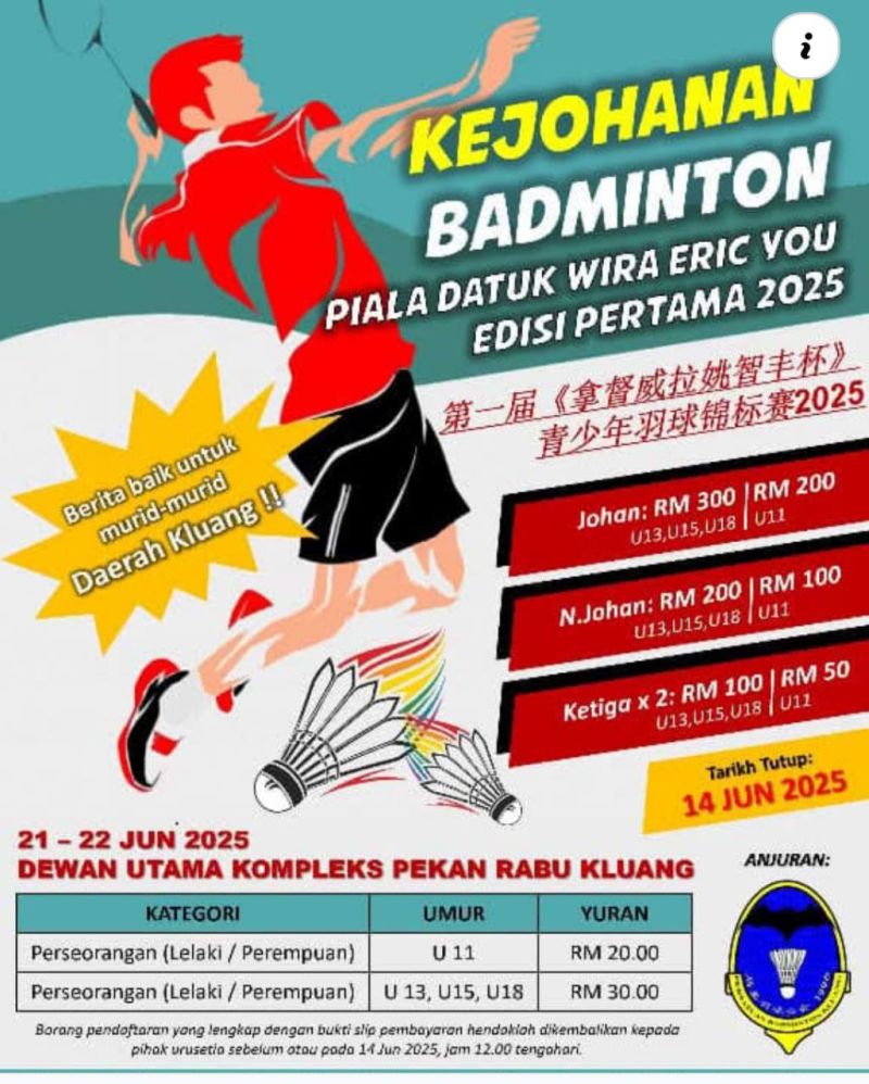 KEJOHANAN BADMINTON REMAJA DAERAH KLUANG 2025-PIALA DATUK WIRA ERIC YOU-EDISI PERTAMA