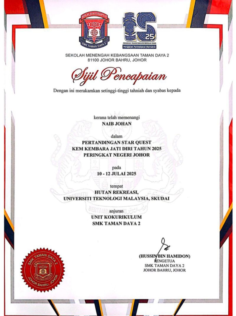 1 | MUHAMMAD ADAM IKRAM BIN MUHAMMAD YUSRY | Naib Johan |