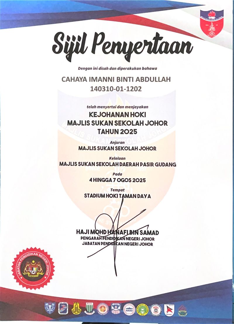 1 | CAHAYA IMANNI BINTI ABDULLAH | Penyertaan |